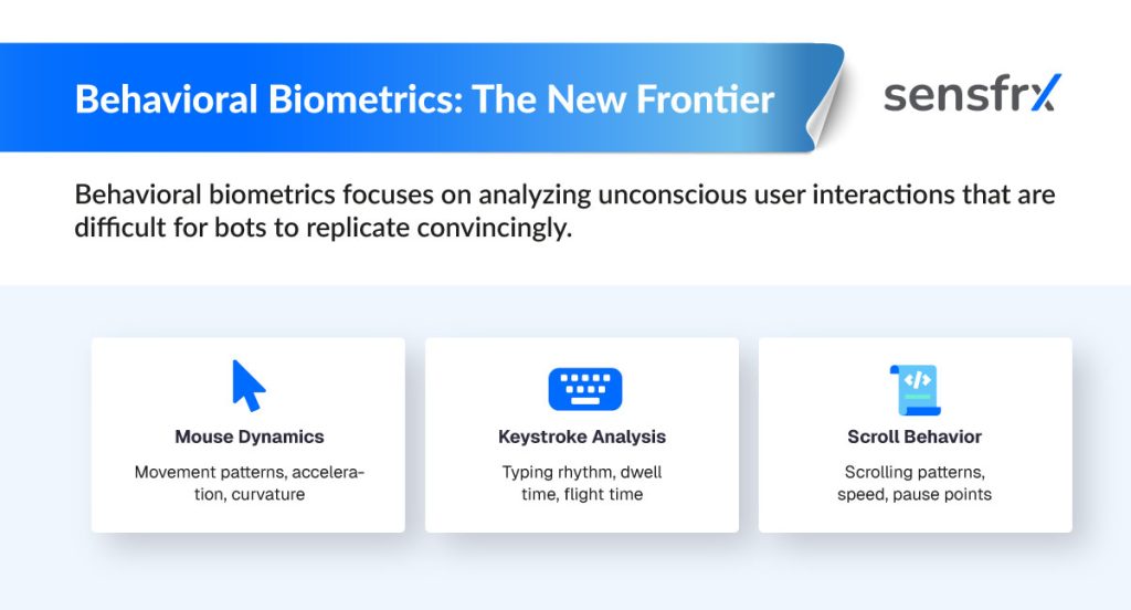 Modern bots emulate human interaction, necessitating behavioural biometrics. Features include: