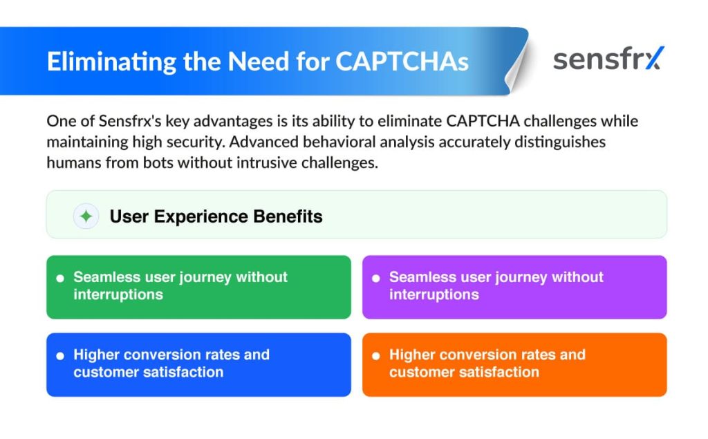 One of the key advantages of Sensfrx is its ability to eliminate the need for CAPTCHAs. As discussed earlier, CAPTCHAs can be a source of friction for users and are becoming less effective against modern bots. By using advanced behavioural analysis, Sensfrx can accurately distinguish between humans and bots without the need for intrusive challenges. This creates a more seamless and enjoyable user experience, which can lead to higher conversion rates and increased customer satisfaction.