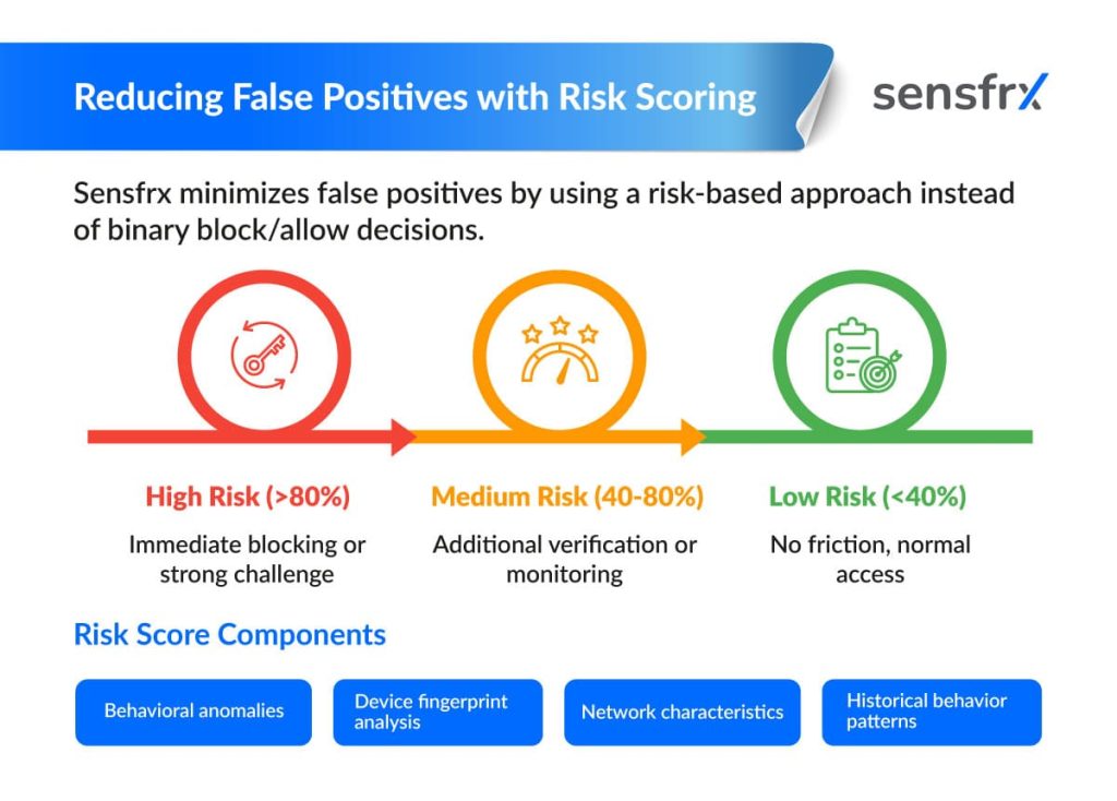 Sensfrx aims to keep false positives to a minimum by using a risk‑based approach rather than a simple “block or allow” decision. Each visitor receives a risk score that reflects their behaviour and other signals.